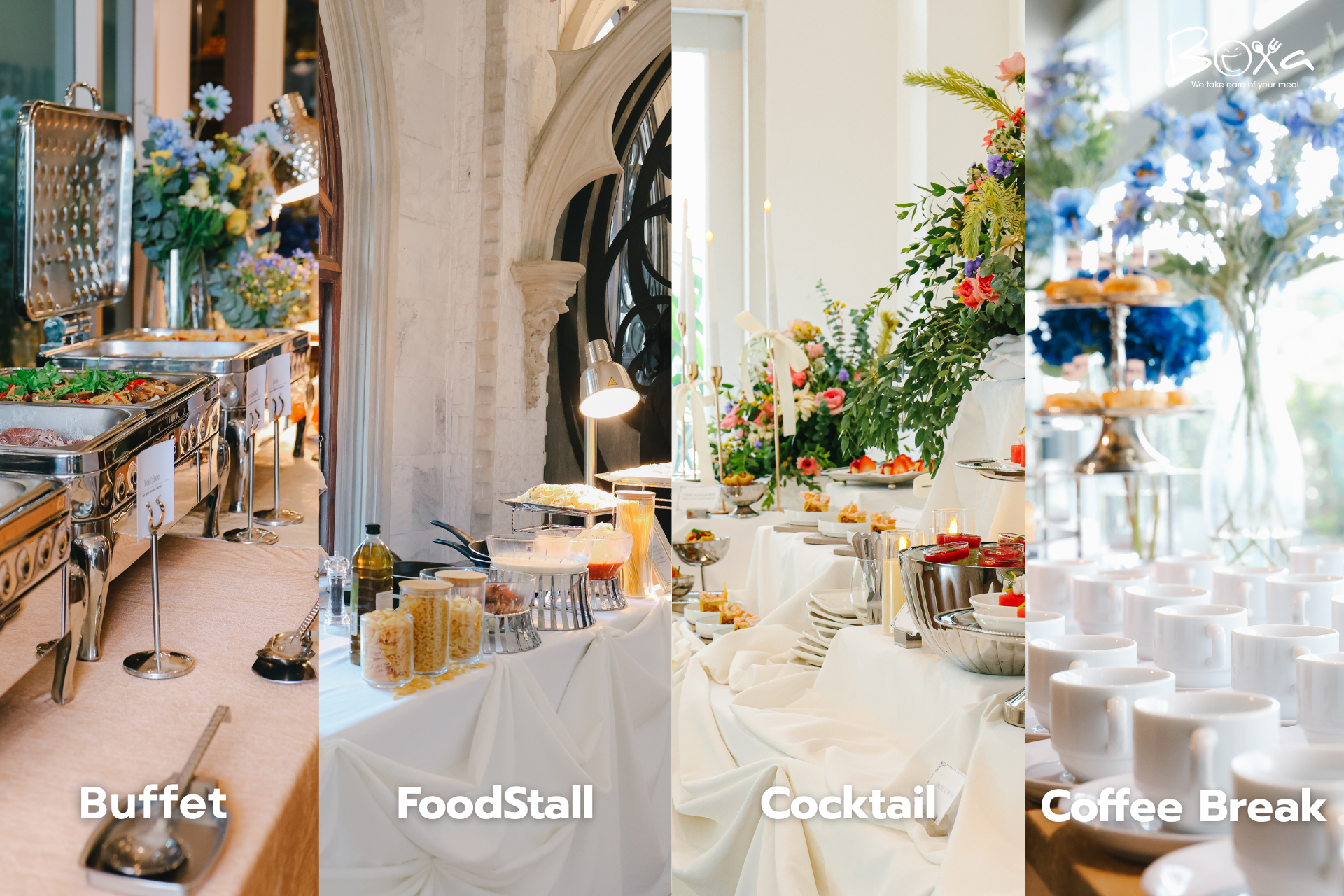 - Buffet + Food Stall (บุฟเฟต์คู่ซุ้มอาหาร): ผสมผสานระหว่าง ตักอาหารด้วยตนเอง กับ ซุ้มอาหารปรุงสด เสิร์ฟจานต่อจานให้แขกในงาน ได้ทั้งความหลากหลายและความสดใหม่จากเตา